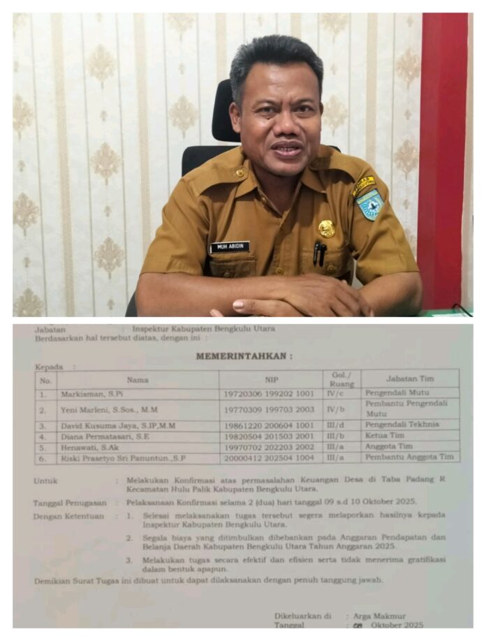 Surat Kepala Desa Taba Padang R, Kecamatan Hulu Palik, Kabupaten Bengkulu Utara, Nomor: 140/132/SP/KDS/TBR/IX/2025 tanggal 24 September 2025 tentang permintaan pemeriksaan Kaur Keuangan. Hal itu menunjukkan bahwa sistem pengelolaan keuangan desa tersebut benar-benar bermasalah. Jika Dana Desa dapat digunakan semena-mena oleh kepala desa dan perangkatnya, tentu Inspektorat tidak perlu menghabiskan anggaran besar untuk audit.